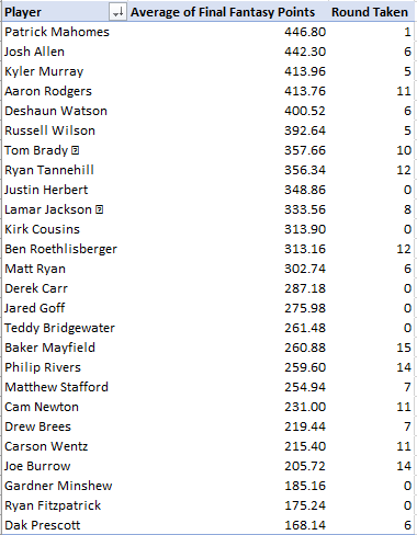 Today I will start with QB’s. My data will include every QB that was drafted in our league as well as any QB that finished in the Top 25 that was not originally drafted. A few QB’s were injured (Dak, Burrow, Brees) players being benched (Fitzpatrick, Minshew and Wentz) but that’s fantasy. Below is the list I have compiled and what round they were drafted.