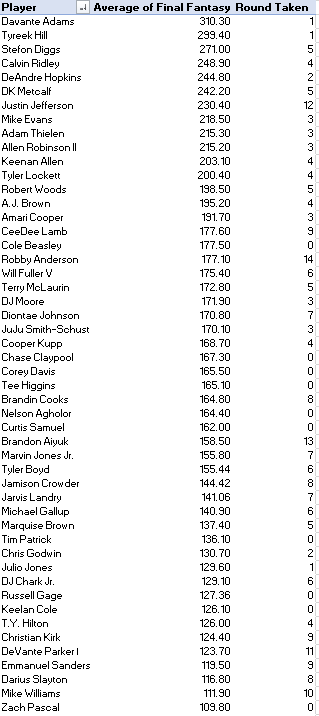 Today I will be taking a look at WR’s in 2020. In round 1 we saw 4 WR’s drafted in the first round (Michael Thomas, Tyreek Hill, Davante and Julio Jones) in that order. MT WR64 and Julio WR40 battled injuries all season long and didn’t pan out as expected. On the flip side Adams and Hill finished as WR1 and WR2 respectively.