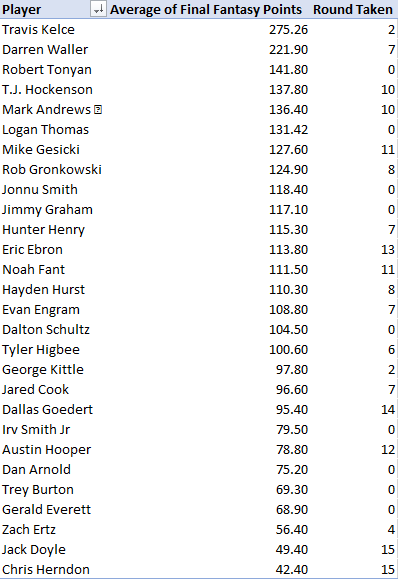 In my previous posts I mention my strategy on waiting to draft a QB. I have a similar strategy when drafting TE’s as well. With only a few top tier TE’s I feel its best to load up on RB and WR’s in those early rounds. I would even recommend drafting a QB before a TE. As you can see 2 of the top 6 TE’s went undrafted Robert Tonyan TE3 and Logan Thomas TE6. With only and handful of dominant TE’s you have a better chance of hitting on a mid tier TE in the later rounds than risk drafting an elite TE that gets hurt or underperforms.